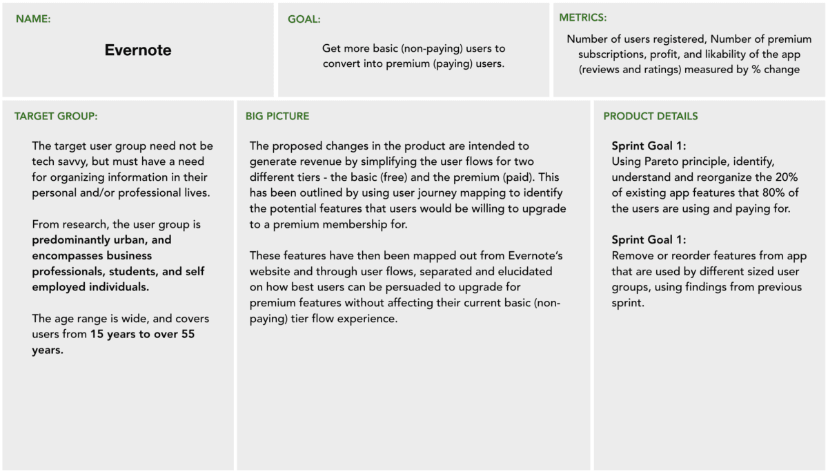 Evernote is a global leader in information organization, yet it faces a common "Freemium" challenge: while it boasts over 200 million users, only 3.75% contribute to revenue as premium subscribers. As part of this Product Canvas exercise, I explored how strategic UX interventions and feature re-prioritization could drive higher conversion rates from basic to premium tiers without alienating the core user base.